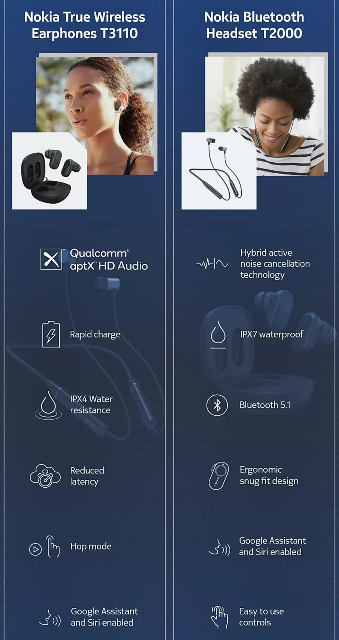 Nokia T2000 | The neckband is made up of polycarbonate material while its wires are all rubbers . The headphones are powered by qualcomm's qcc3034 bluetooth audio . The nokia t2000 bluetooth headset is powered by the qualcomm qcc3034 bluetooth audio soc and supports sbc, aac, qualcomm apt x, and aptx hd. The nokia t2000 looks stylish and fits right in your ears. The t2000 nokia headset has been made in the popular neckband style headset.